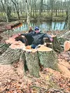 Joel Bowman, owner of Bowman’s Tree Service, sits inside a large tree stump from a removal project.Submitted