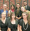 Cast members of Carrollton High School’s production of Hadestown, a folk musical retelling the Greek myths of Orpheus, Eurydice, Hades and Persephone, include Eva Nicholas, front left, Violet Burkholder and Lydia Oboy; Isabella Nuzzolillo (Hermes), back left, Victor Zacapala Diaz (Orpheus), Railey Macke (Eurydice), Logan Pridemore (Hades) and Rylee Champion (Persephone).