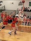 Carrollton's Emma Shafer rises above her opponents as she tries to finesse the ball into the basket during a Jan. 7 home game against EBC foe Minerva. Shafer scored 15 points to lead the Warriors to a 51-27 victory.Mark Tucker