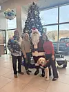 Members of the Loudon family pose in front of the Christmas tree at Loudon Motors Ford, including owner Greg Loudon and his wife Mandi Loudon, Seth Loudon dressed as Santa, his fiancée Ida, and the family dog Hank.