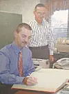 Retiring Carroll County Treasurer John Yeager looks over the shoulder of his nephew, Jeff Yeager, who became Carroll County’s new treasurer Sept. 6, 2005.File