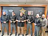 The three award winners of the year holding their plaques are Jeremy Moore, left, Shawn Hardwick and Ben Cheney. They are flanked by Capt. John Thompson, far left, Sheriff Mark Touville, right and Capt. Todd Smith.