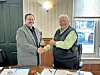 Commissioner Dave Hall, left, officially receives the gavel of chairman of the board of the Holmes County Commissioners from 2025 Chairman CommissionerJoe Miller.