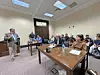 Holmes County probation officers Brodie Williams, left, and Dave Williams are joined by prosecuting attorney Rob Hendrix as Dave Williams explains what he believes should be the proper punishment for a young Amish girl accused of theft during the recent mock trial.Dave Mast