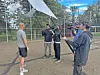 The movie production team of Zosimo Jay Maximo, right, and Dan Mizicko film former Hiland Hawks basketball All-Ohioan Jason Mishler as part of the finishing touches of the documentary "Angel in Amish Country," the story documenting the impact Perry Reese Jr. had on the many lives he touched while coaching at Hiland.Dave Mast