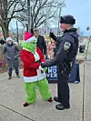 The Grinch was up to no good this weekend, handing out onions to kids during the annual parade and even knocking a Christmas present from the hands of Mount Vernon Mayor Matt Starr at the lighting of Public Square Sunday in downtown Mount Vernon. But Mount Vernon Police Officer Ben Fike was on the job, arresting the Grinch and saving Christmas for Knox Countians.Denise Neff