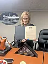 Mount Vernon City Council member Tammy Woods, left, accepts a gift from Mayor Matt Starr during the council meeting Monday. Woods was honored for six years on council.Submitted