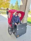 Alyssa Gomez-Lawrence of Kenyon College, left, gives Knox Public Health's Tammy Ruhl a ride in one of Happy Spokes' new trishaws.Denise Neff
