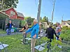 Laura Akgerman of Ohio State University Extension, left, explains to attendees at the Meet Me in the Garden Series how to properly stretch before working in their garden to help prevent injuries.