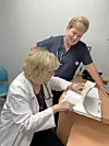 Sue Ellwood, seated and RN volunteer Debbie Colburn review a chart to prepare for an office visit.