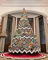 The 11-foot tree, made entirely of crocheted granny squares and topped with a crocheted Moravian star, was spearheaded by community members Cathleen Misko and Sherri Perry. Inspired by the work of Pat Boron and a similar tree displayed at the New York Public Library, Misko and Perry have taught many to crochet this year, collecting hundreds of squares from nearly 60 community members of all ages.