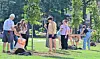 Volunteers from the community warmed up with stretches led by a student-athlete and then spread nutrients and mulch around each of the trees.