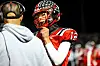 Orrville quarterback Cameron Kraft talks with a coach in between possessions.